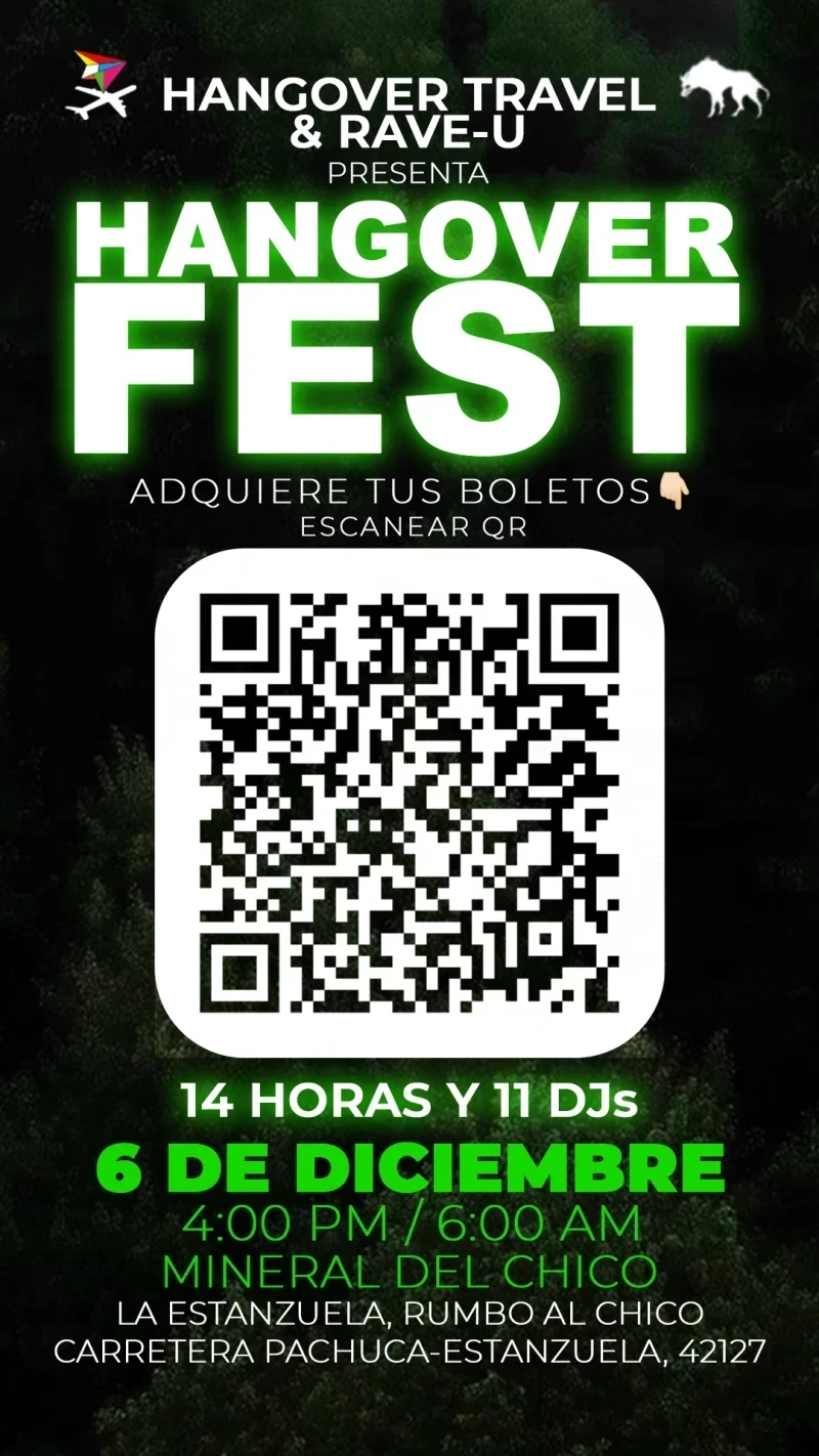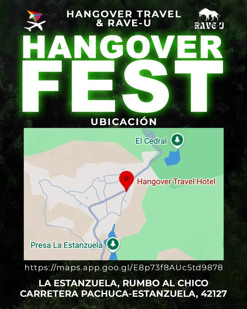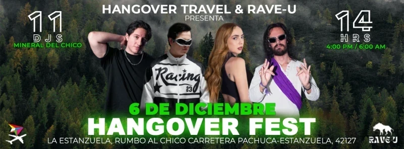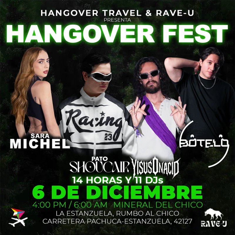 Prepárate para vivir una experiencia musical única e inigualable. RAVE Hangover es mucho más que un evento, es un viaje sonoro de 14 horas ininterrumpidas que te transportará a través de los mejores géneros de la música electrónica. En el exclusivo Hotel La Estanzuela, ubicado en el pintoresco rumbo al Chico, transformaremos este espacio en el epicentro de la escena electrónica. Desde las primeras horas de la tarde hasta el amanecer del domingo, los beats no pararán de sonar.